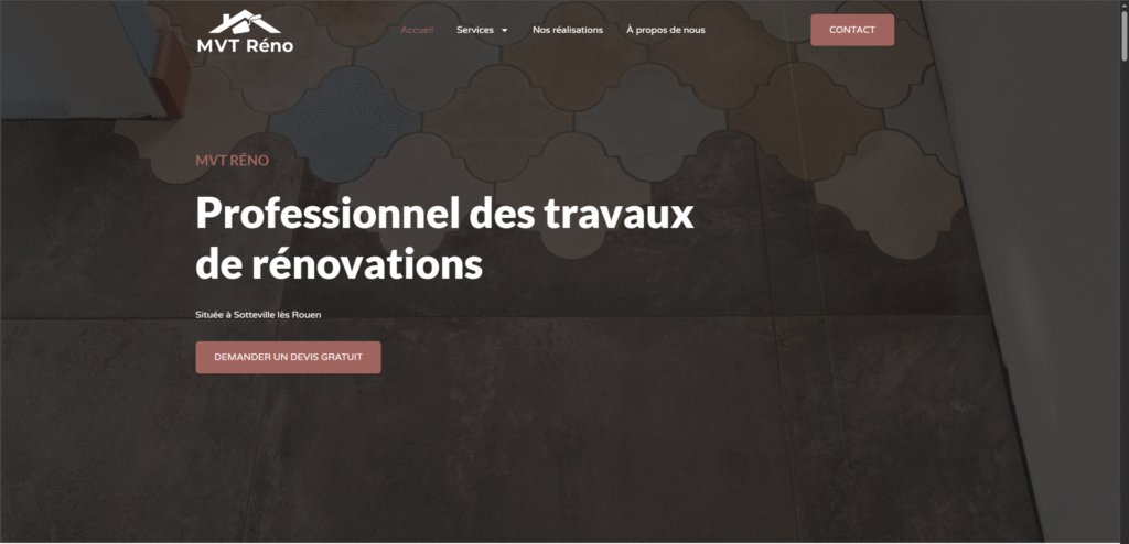 Mon objectif était de fournir à MVT Reno une vitrine web claire et professionnelle, capable de présenter l’ensemble de leurs services de rénovation intérieure et extérieure, tout en inspirant confiance aux clients potentiels (particuliers ou propriétaires). J’ai pris en charge l’intégralité du projet : de l’installation de WordPress à la mise en ligne, en passant par le design, la structuration des contenus, et le développement des pages métier (services, réalisations, contact).